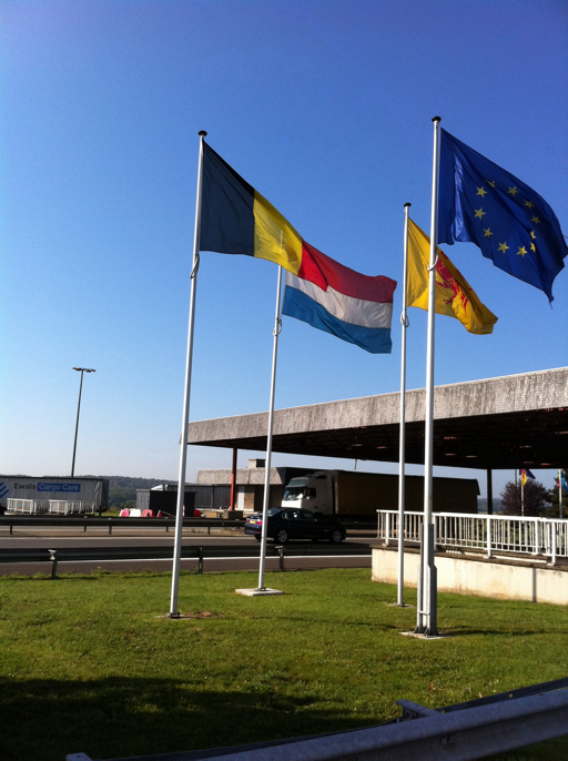 About an hour after leaving Luxemburg downtown, we crossed the Luxemburg border into Belgium. Here’s the old border crossing which is no longer needed since the creation of the European Union. The flags are the Belgian flag on the left, the Luxemburg flag to its right, and the European Union flag on the far right. I don’t know what the yellow flag with the chicken is . . . France, maybe?
