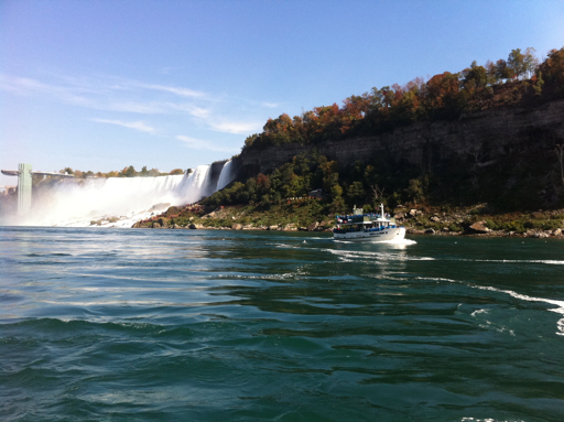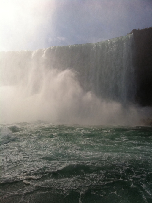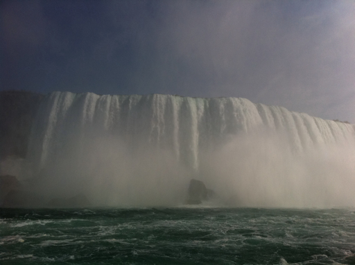 First, the boat passes the American Falls. They’re not anywhere near as high nor as impressive as the Canadian Falls, but they’re still pretty incredible. I think there’s been more erosion at the site of the American Falls, as you can see from the giant boulders at the bottom.