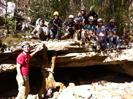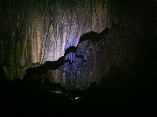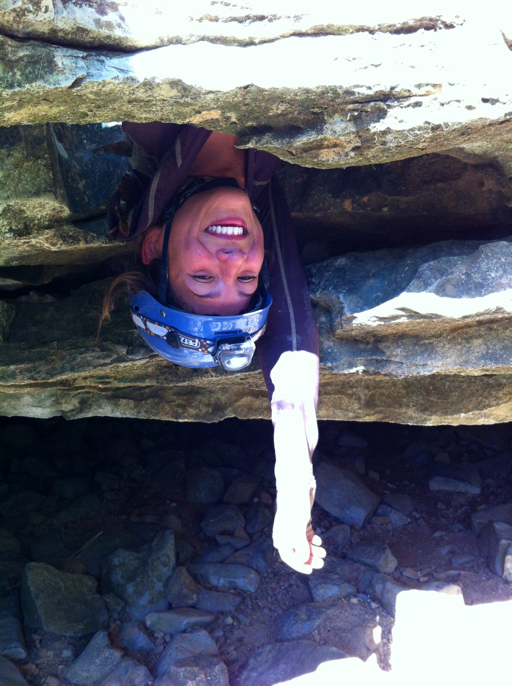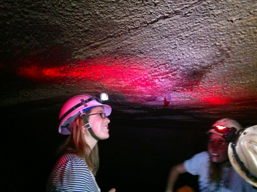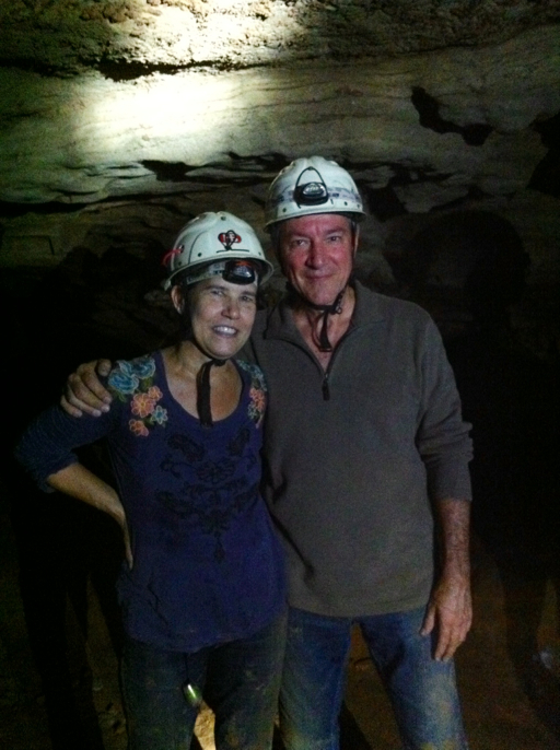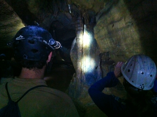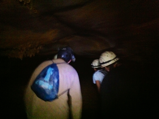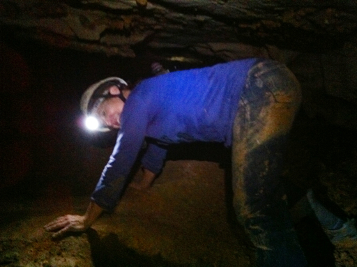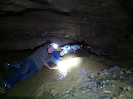 The cave opening didn’t look that difficult, but it turned out to be a rock crawl for the first 50 feet. (That’s Dale in the blue shirt, white helmet, and Kelly in the purple shirt, blue helmet.)