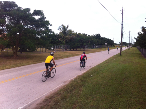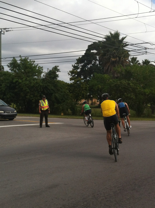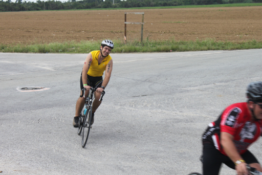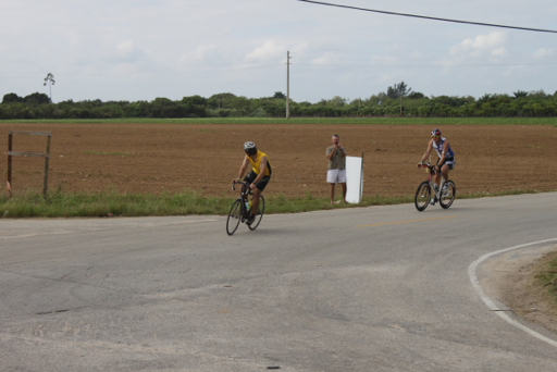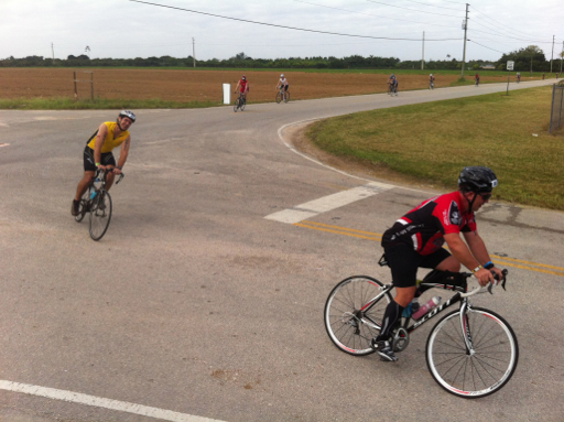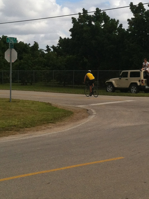 We caught up to Kyle and Jordan at the southermost part of the course and waited at the turn. Here they are the first lap (Jordan in blue, then another rider in red, then Kyle in yellow):