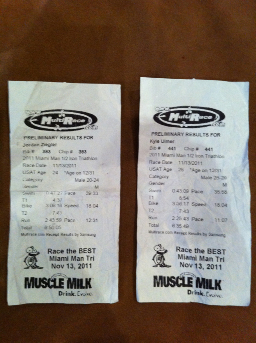 Yesterday, we got up early and drove to Miami to watch Kyle and his friend, Jordan Ziegler, in an Iron Man competition. The race is a half triathlon, consisting of a 1.2 mile swim, followed by a 56 mile bicycle race, followed by a 13.1 mile run.