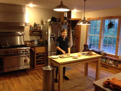 Dale cooked dinner at home tonight. She loves the big kitchen here, especially the commercial gas range and oven, and the butcher-block table.
