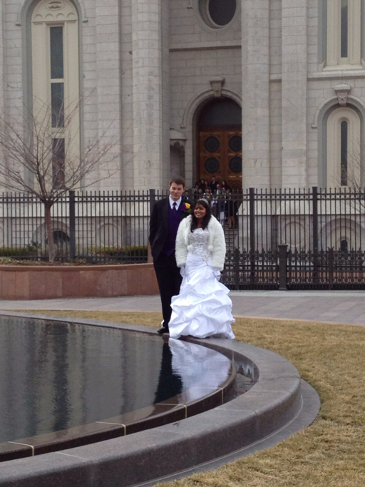 The Temple is only open to members of the Mormon Church. Several of its floors are used for instruction and indoctrination of members. Additionally, several floors house 70 “sealing rooms” which are used for wedding ceremonies. We were told that they have had as many as 130 weddings in a single day in the Temple. The sanctity of matrimony is a central tenet of the Mormon faith. There were several weddings underway while we were there. Here’s a newlywed couple posing for a wedding photograph, while another wedding party exits the Temple in the background.