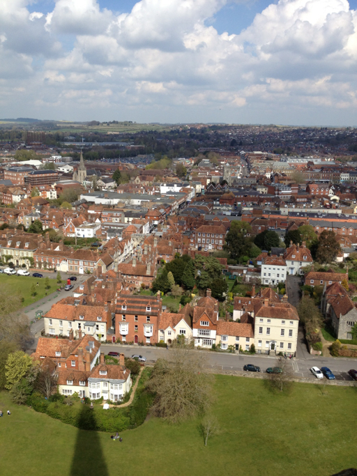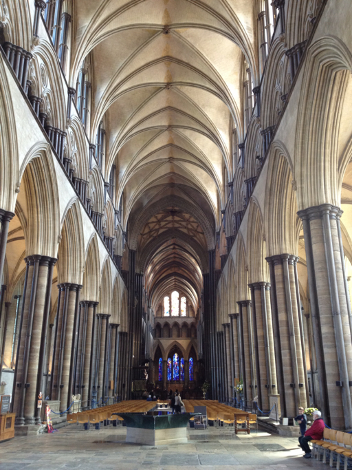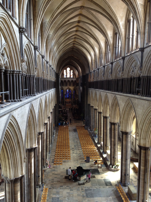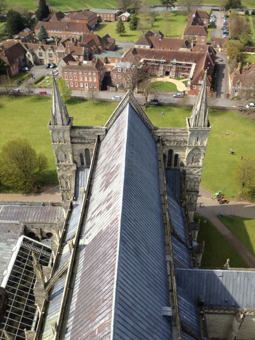 After breakfast yesterday, we took the extended tour of the interior of Salisbury Cathedral which included a 334 step hike up the spire, the tallest in Great Britain – at 404 feet! I know this because the Guiness Book of World Records has certified it, as evidenced by a plaque inside the spire where the public access stops.