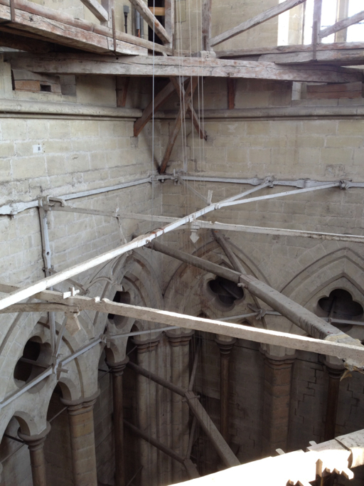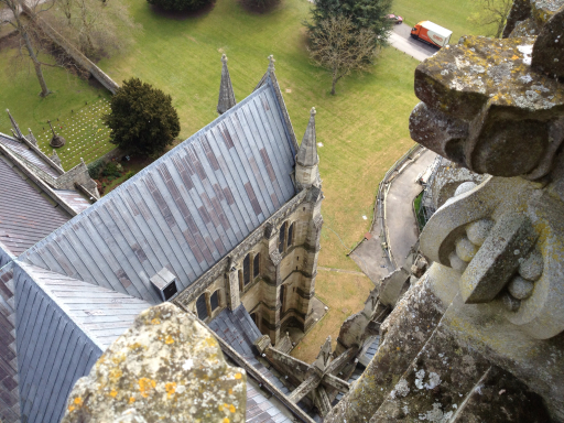 Here’s a view looking back down onto the Nave; the attic we walked through is under that lead roof.