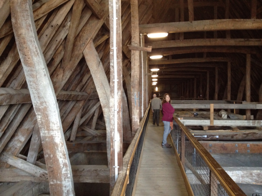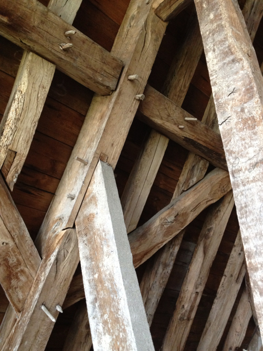 Construction of Salisbury Cathedral was begun in 1220 and completed about 30 years later. All the structural components you see in the above picture are original. The vertical (slightly diagonal) supports were made by sawing huge oaks trunks and branches that had the natural shape sought by the builders: one half was used on the left; the other on the right, perfect symmetry. As you can see in the picture, below, all of the joinery was done with mortise and tenon and wooden pegs and dogs; no metal was used in those days for building with wood in most construction.