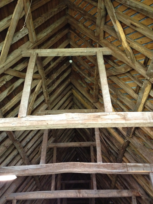 The roof joists in this section of the attic were a style known as a Double Queen Post. The wooden roof sheathing was laid horizontally on the roof framing and then sheets of lead were laid over the sheathing for waterproofing. The weight placed on the stone foundation from the roof is tremendous.