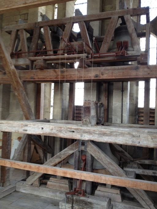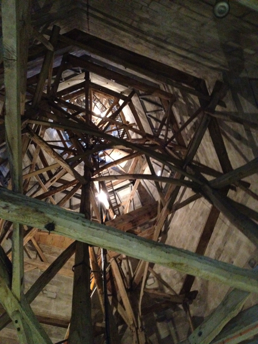 At one level along the way, we stopped to see – and hear – the bells toll. The bells do not move, it would create too much movement within the spire at such a height; they are rung by hammers attached by cables to a mechanical clock mechanism down at the attic level. The large bell at the bottom was brought up into the spire in the 1600s after the original bell tower, which was a separate building and much lower and smaller, was destroyed. The four smaller bells, which ring on the quarter hour (and did while we were standing next to them), were added even later.