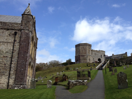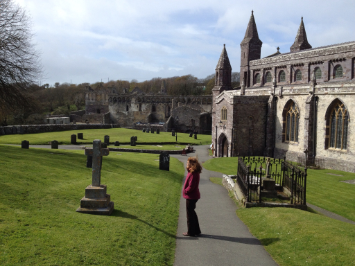 In this picture, you can see St. David’s Cathedral in the foreground, right; the ruins of St. David’s Bishop’s Palace is in the background, left.