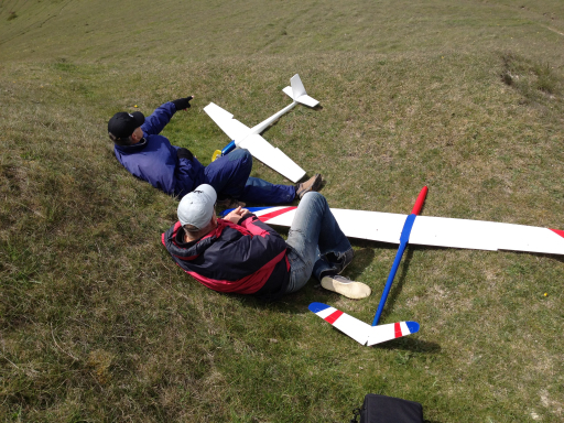 Nearing our destination, we met two gentlemen out flying their remote-controlled gliders. Here they are near the top of appropriately named Windover Hill, waiting for the wind to let up a little.