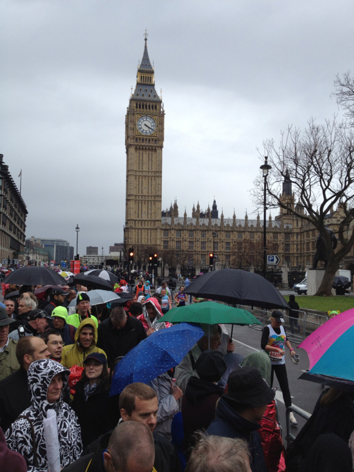We followed the crowds, trying to escape, and ended up walking past Big Ben (you can see the last finishers of the marathon on the right).