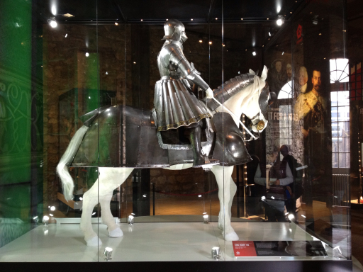 I went inside the White Tower while Dale rested with a cup of tea. The interior has been turned into a museum of medieval weaponry and armor. The photo below shows the parade armor of King Henry VIII, made in 1516. Henry did like to joust in his earlier years, though later in life he became quite obese with a waist measurement of 54″, so I doubt he did much horseback riding toward the end.