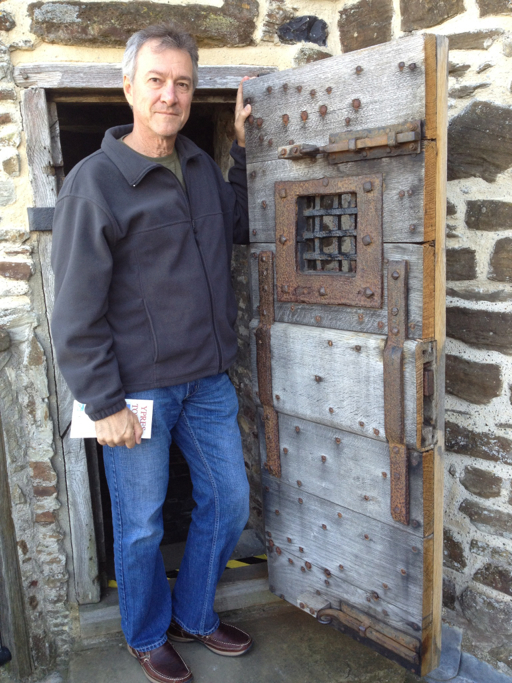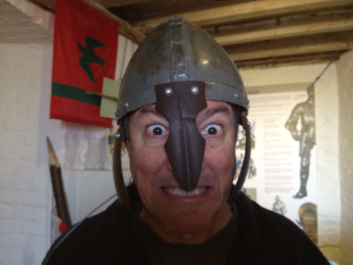 Down in the basement, they had an assortment of knight’s helmets from different periods (they are progressively more recent in the following photos). I tried them on with my best grimace:
