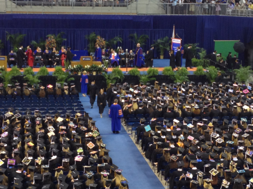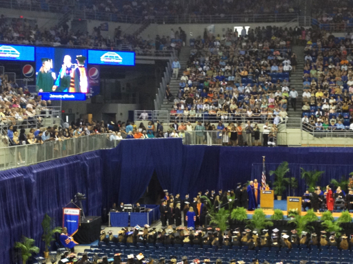 The graduation ceremony was in the University’s O’Connell Center. That’s Kelly on the big screen and at the podium, about to make her way across the stage.