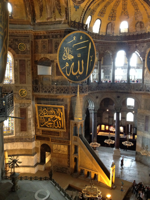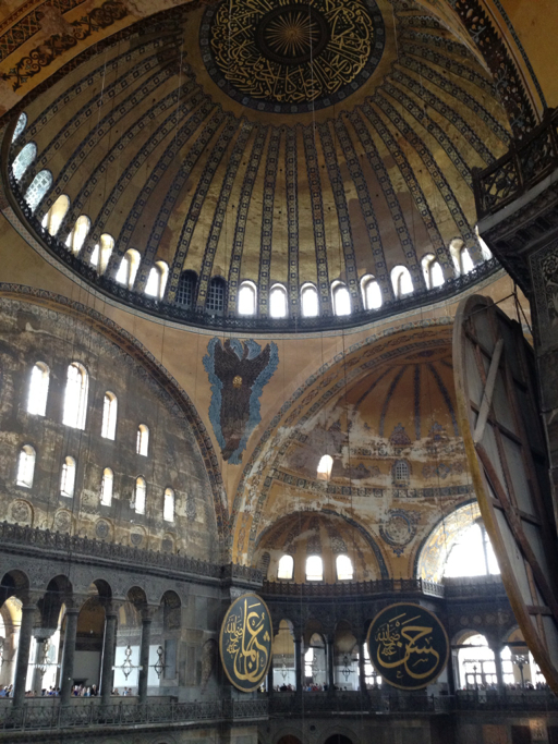 The reason for the first is that in 1453, Constantinople was sacked and the Byzantine Empire was conquered by the Ottoman Turks. Immediately after entering the city, the muslim Sultan Mehmet II ordered that the Hagia Sophia be converted into a mosque, renamed the Aya Sofya. As a result, all the Christian symbols and relics were destroyed or removed and the walls and mosaics plastered over. Minarets were added to the exterior. The script you see was later placed around the dome, proclaiming the names of Allah, the Prophet Muhammed and the first four caliphs.
