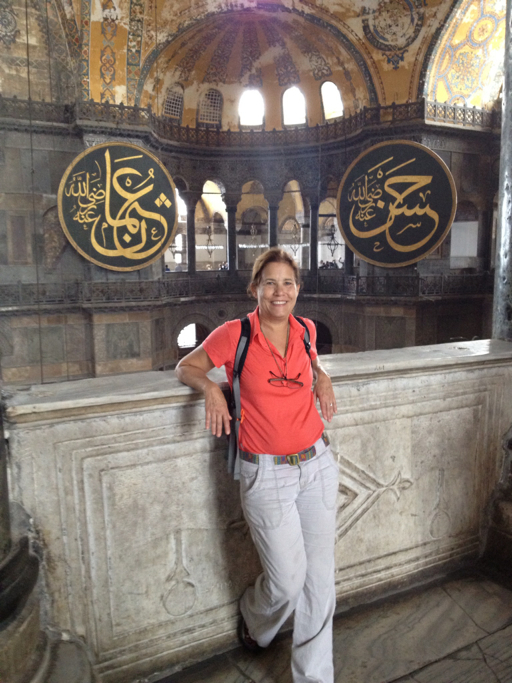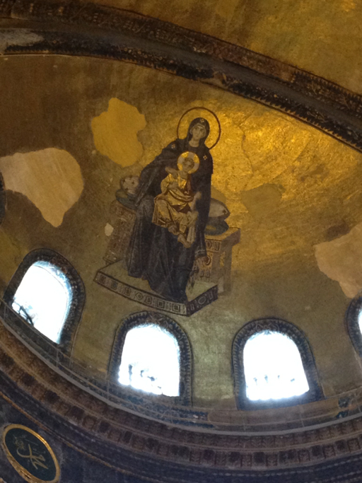 We finished our visit of the Hagia Sophia’s mezzanine and went back downstairs to where the altar would have been. After the fall of the Ottoman Empire in WWI, the new Turkish nation set about restoring the Hagia Sophia to its former glory, removing the plaster that the Ottoman Turks had put up; underneath, they found a number of the old, Christian mosaics. This one is on the dome, above where the altar would have been:
