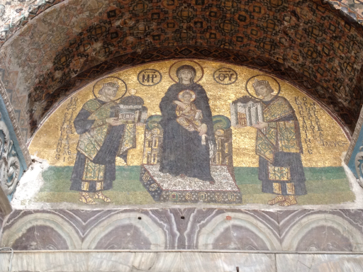 And this mosaic from the 900s is found in the southwest exit: the Virgin Mary holding Jesus, flanked by Emperors Justinian and Constantine.