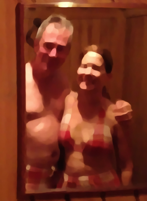 I took the picture, above, in the mirror in the changing room, showing off our bathing costumes, but taking care to pixelate the photo to protect the innocent. Photography, of course, is not allowed inside the baths.