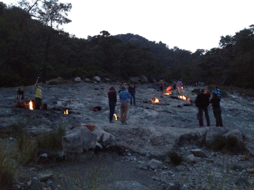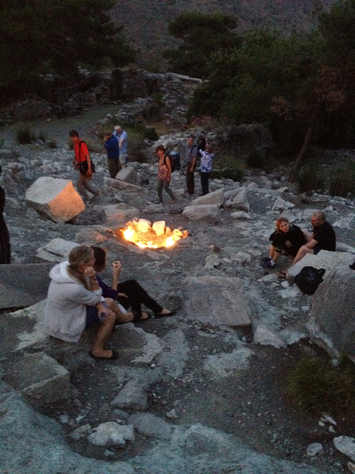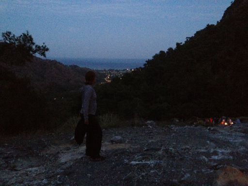 We started our hike after dinner, just as the sun was setting behind the mountain. There was an eerie feel to the place as we approached, with people huddled around campfires up the mountainside.