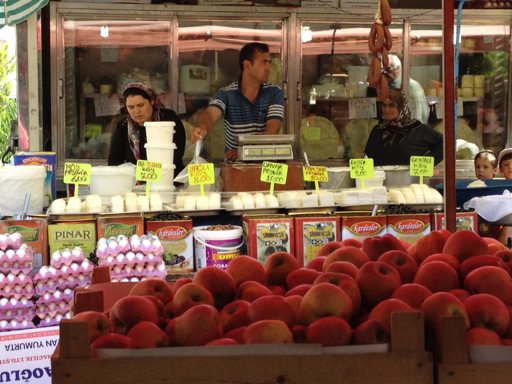 For 10 Lira, the equivalent of $5.50, we had chicken kabobs, pita bread, olives, tomatoes, cucumbers, various greens, a yoghurt drink that was, um, interesting, tea and the Turkish equivalent of baklava. Not only good food and a great value, but free entertainment, watching the shoppers and vendors in the bazaar while we ate. By the way, the cheeses here are amazing. Here’s a cheese vendor.