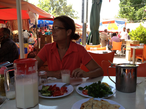 During the day, we have been skipping lunch and nibbling on nuts and fruits that we carry with us. As we walked the market, we came upon a thriving little sidewalk restaurant and decided to stop.