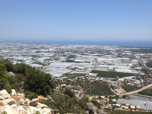 About halfway to Kaş, near the city of Demre, the road turned inland. As we had been driving along, we started to see quite a few shadehouses and greenhouses, full of tomato plants and other vegetable crops. But it wasn’t until we got to a pullout overlooking Demre that we realized just how many shade- and greenhouses there were in this area. The landscape was carpeted with them!