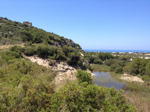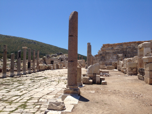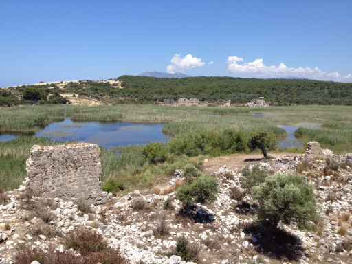 At any rate, the mouth of the harbor, nearly 1/4 mile wide, began to silt up in the 4th century A.D. and the formation of the beach put an end to the port of Patara. Here’s a view of what used to be the harbor entrance before it silted up; that’s an ancient Roman lighthouse up on the hill to the left.