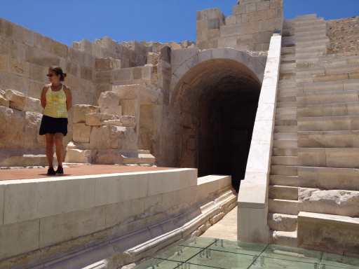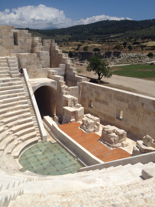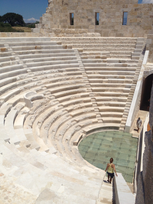 The Turkish government has done an admirable job restoring the Bouleuterion to its former glory. We walked inside and took a couple pictures. Here, you can see where the representatives sat; they elected a “President” annually – his seat is there in the middle.