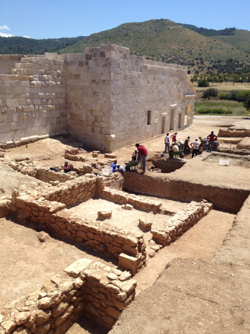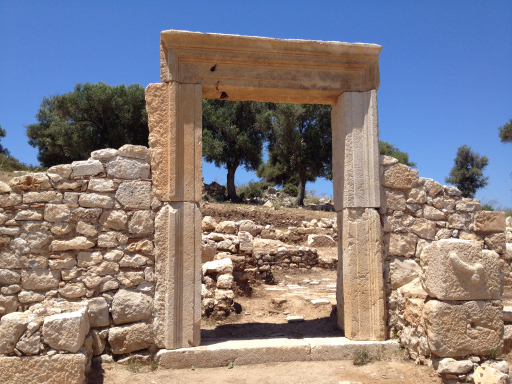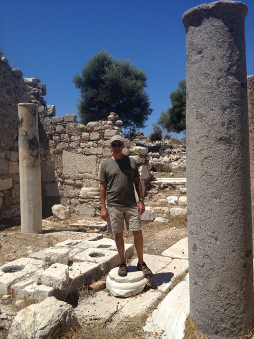 We walked around behind the stage of the Theater, between it and the Bouleuterion, to look at the current archeological work underway. Here, at the back of the Theater’s stage, you can see how much the sand and dunes have covered up.