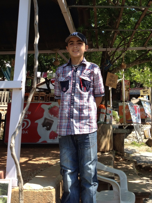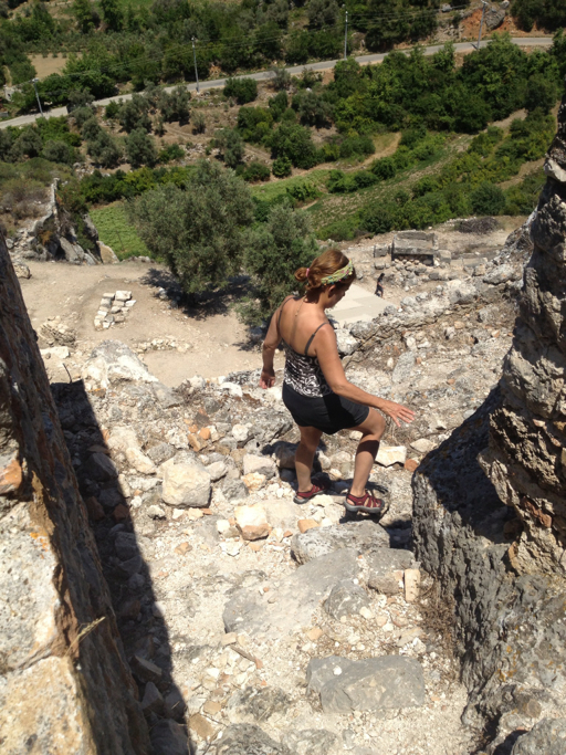 Once we drove to the top of the hill, we were greeted by an amazingly energetic young man by the name of Nail Zorba. He helped me park and then told us to be sure to see the Tomb of Bellerophontes, which he said was accessible from a path that wound around the cliff face and a wooden ladder that we would find there. Then he handed me a professionally published guidebook to Tlos and opened it up, pointing out a picture of himself in living color. He said, in very good English, “Here, take this guide with you. If you like it you can buy it when you get back; if not, don’t.” I flipped through the guide and my eyes lit upon the following passage: “Visitors are not encouraged to go near the Tomb.” Really? “Don’t worry, you can make it,” said Nail, “it’s the best thing here.”