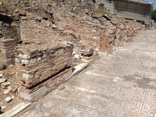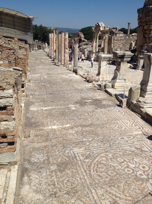 In my last post, I mentioned the Roman villas in Ephesus on Curetes Street, opposite the Temple of Hadrian. We’ll start this post at that point, on the left hand side of Curetes Street, slightly more than 3/4 of the way down toward the Library of Celsus. Here, the Romans constructed multifamily residences on the slope of the hill, lining an elevated promenade covered with mosaics.