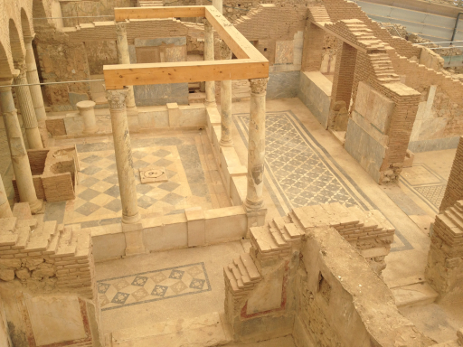 The first level, being dwelling units 1 and 2, has been uncovered and restored and is now being used by the restoration crew as a staging area for reassembling the marble slabs that cover the walls of some of the dwellings.