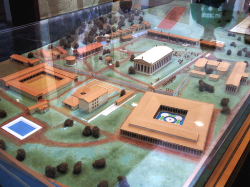 Here’s the model of the grounds. The Paleastra is the square building on the left; the square building on the right was the Leonidaeum, a hotel where visiting dignitaries stayed during their time here. In between the Paleastra and the Leonidaeum was the sculptor’s studio with the Roman basilica built on top of it.