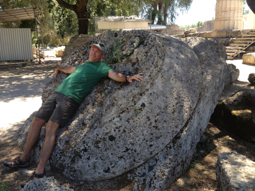 The Seven Wonders of the Ancient World no longer exist, except for a pyramid or two in Egypt. On this trip, we’ve seen where two of the seven previously stood: the Temple of Artemis in Ephesus; and the Statute of Zeus in Olympia. All that remains of the Temple of Artemis is a lone, reerected column that was so unimpressive that I didn’t even bother to photograph it. However, while the Statute of Zeus may be gone (it stood 40 feet high and was gold-plated), the ruins of the temple that housed it in Olympia are extensive.