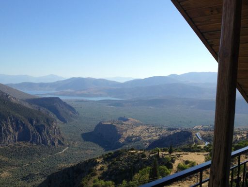 After touring ancient Olympia yesterday, we drove for five hours to Delphi on the Greek mainland. The ancient Greeks considered Delphi to be the center of the world. It’s easy to see how they could have come to that conclusion, high atop the mountains. Here’s the view from our hotel room at the Hotel Acropole.