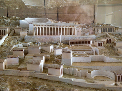 Like the other archeological sites we have visited in Greece, Delphi had a fantastic museum housing artifacts uncovered at the site, as well as a model of the grounds. In this model, you can see the Sacred Way leading up to the large white Temple of Apollo, with the Theater above it on the mountainside: