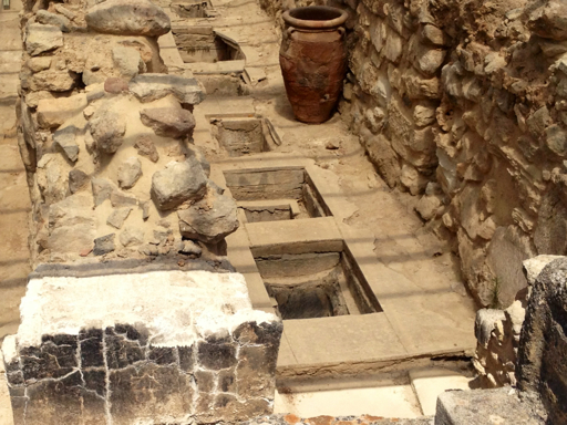 One of the things that is pointed out in support of the theory that the Minoan civilization came to an end because of a Mycenaen attack, rather than as a result of the volcano and tsunami, is the fact that the ruins show evidence of being burned, which you can see in the lower part of the photo of the storerooms, below.