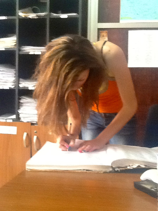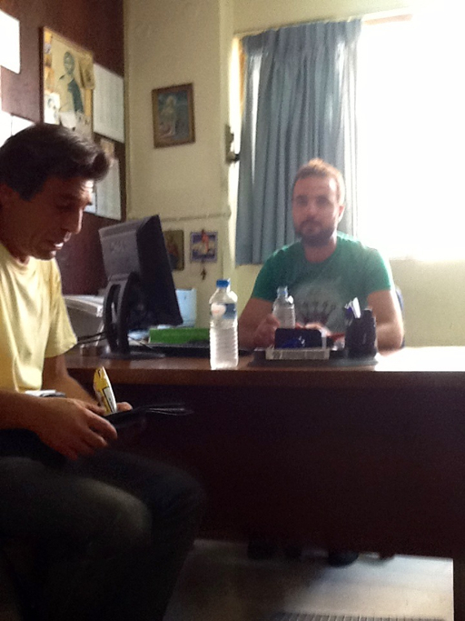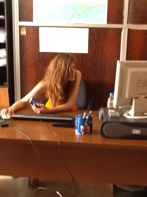 Niko and I went upstairs where the receptionist (yep, that’s the police station receptionist in that photo) was busy watching TV, too (she’s holding the TV remote).