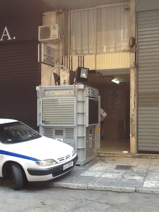 …not so much because I had any expectation that the police would do anything, but I couldn’t resist tooling around Athens on the back of Niko’s scooter; plus, I thought it would be interesting to see the inner workings of the agency that is supposed to protect the populace and prevent graffiti.
