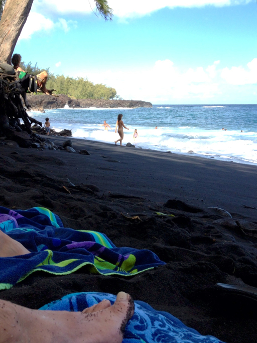 Kehena is a beautiful black sand beach, hidden from the world and shaded by the cliff and towering palms and pines.