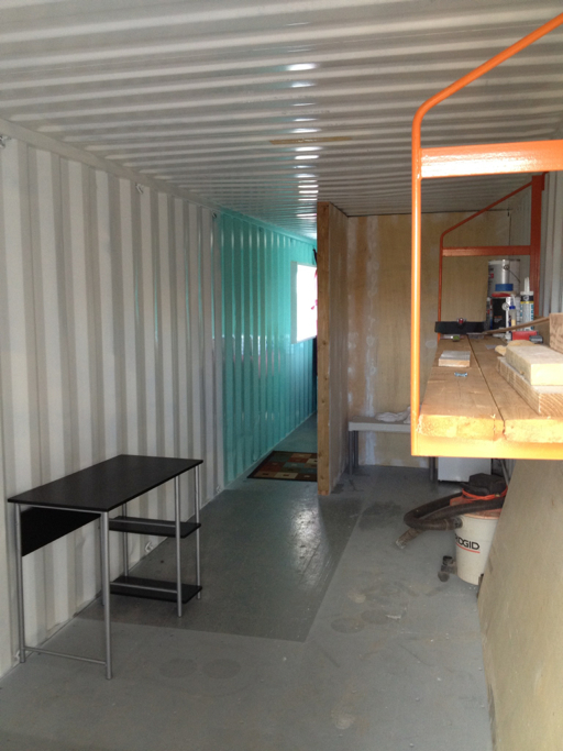 After the arena, Alex took us to see his living quarters, just a little way down the hill from the rodeo arena. He’s converting a shipping container into an apartment. Here we are at “Home Sweet Container.”
