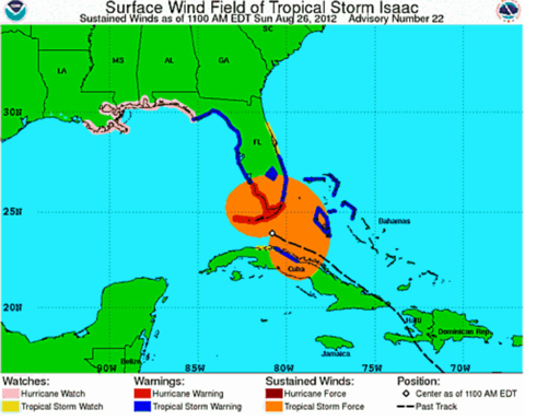 We spent yesterday and this morning preparing for Hurricane Isaac’s arrival. Here’s the current position: