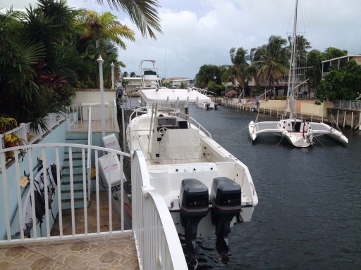 We’re leaving the boat on the lift, strapped fore and aft. About half the boat owners on the canal are doing the same as us; the other half (inboards and sailboats) have tied off in the middle of the canal.