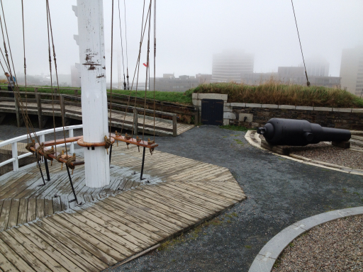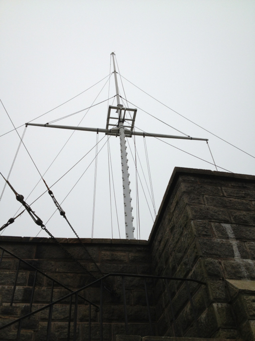 In the distance, through the fog, we could see the city of Halifax. Looking inward into the main fortress again, take a look at the base of the mast, perched on the top of the fortress wall. It is rigged just like a ship’s mast.