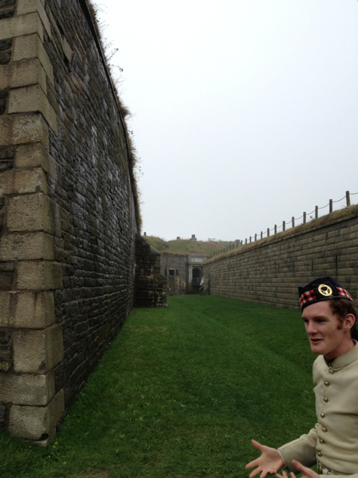 Our tour guide, dressed in period uniform of the 78th Scottish Highlanders, took us through the inside of one of the ravelins, then out into the “moat” that separated the ravelins from the main fortress.