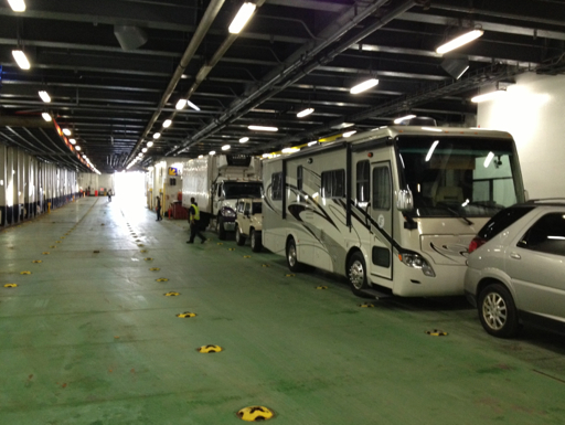 Here’s a photo of our RV at the front of the line inside the hold of the ferry, the MV Princess of Acadia, as the ship was being loaded.