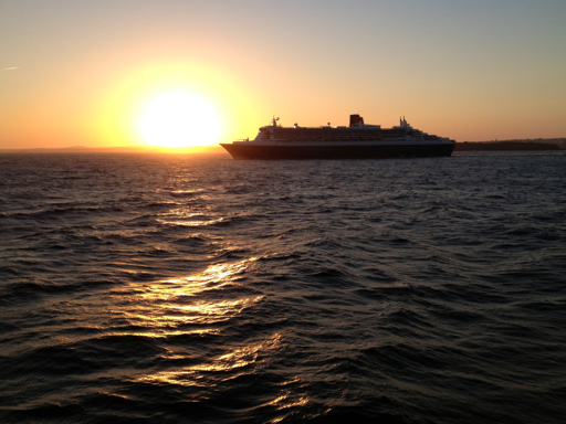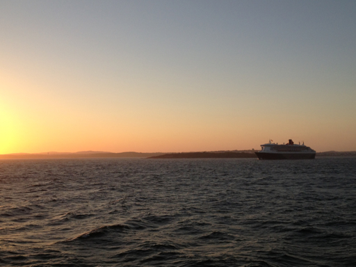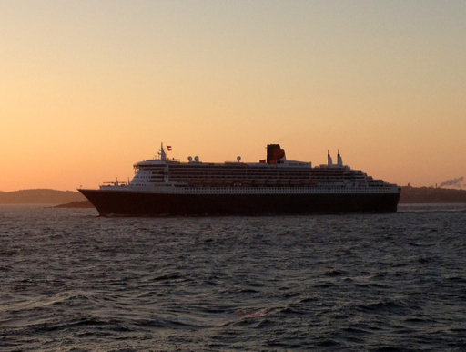 What an amazing coincidence! The Queen Mary II is the largest cruise ship in the world and we didn’t even know she was in Canada, much less that we would pass her as we made our own course across the Bay of Fundy. We learned about the Queen Mary II last year from our relatives in Germany, the Langners; they had seen the Queen leaving the port of Hamburg and Christopher had taken an amazing series of photos of her transit out of the port (we’re looking forward to the Langners visiting us in the Keys this coming August).