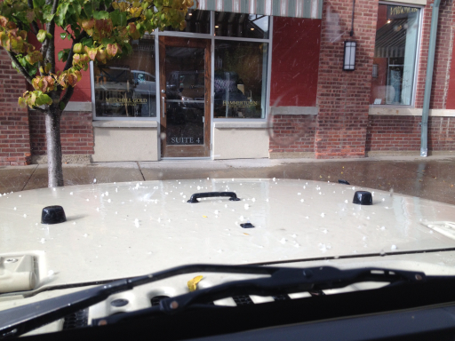 Just as we pulled into the parking lot, it started to hail. You can see the hailstones on the hood of my Jeep. They were the size of 1/4-inch ball bearings! Weird; it was in the 70s at the time.