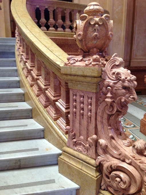 Just look at the balustrade with its pink and yellow marble, scrubbed clean of its century of smoke and grime…