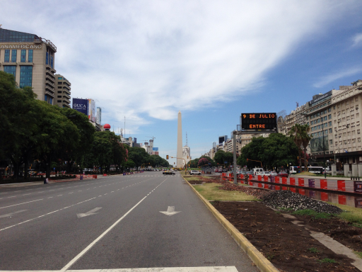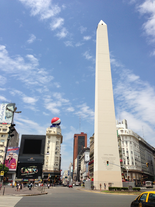 That Washington Monument looking structure down the avenue is the Obelisco, a nearly 200-foot tall obelisk constructed in 1936 to mark the 400th anniversary of the Spanish landing here. The Obelisco sits in the middle of the Avenida 9 de Julio, surrounded on all sides by buildings and electronic billboards reminiscent of Times Square in New York City.